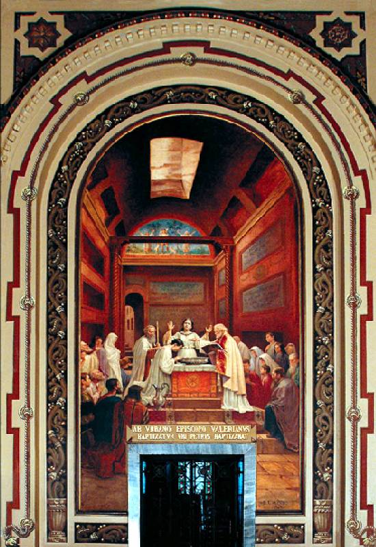 Datado de 1909, este óleo sobre tela de 350 x 190 cm, intitulado O Batismo de Valeriano, pertence à Igreja de Santa Cecília, da capital paulista: