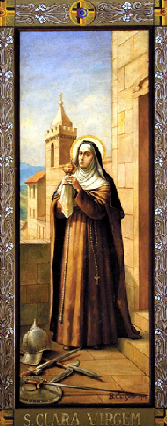 Datado de 1918, este óleo sobre tela de 270 x 78 cm, intitulado Santa Clara Virgem, pertence à Igreja da