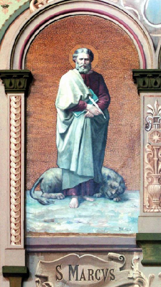 Datado de 1925, este óleo sobre tela de 200 x 100 cm, intitulado São Marcos, pertence à Igreja Matriz de São Domingos, de Catanduva-SP: