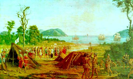 A tela, datada de 1900, retrata o desembarque de Martim Afonso de Souza, com centenas de companheiros, no futuro local de São Vicente, em 1532, onde fundaria oficialmente a primeira vila do Brasil.