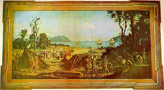 Como teria sido a fundação de São Vicente por Martim Afonso de Souza, em 1532, é o tema deste óleo sobre tela, que Benedito Calixto pintou sob encomenda da Prefeitura de São Vicente, em 1900, usando como referência documentos da época. A tela (de 65x100 cm) ficou exposta no Salão Nobre da Prefeitura de São Vicente (clique na imagem para ampliá-la):