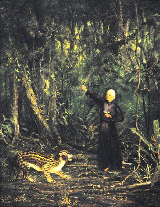 jesuíta José de Anchieta, empunhando a cruz, pacifica as ferras e, junto com elas, a própria terra brasileira e seus habitantes. Este óleo de Calixto,