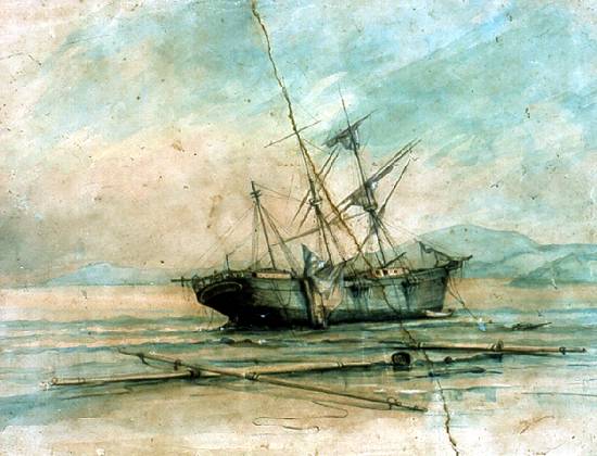 Um navio encalhado na Ponta da Praia santista em 1909, o pequeno vapor Gloria, serviu como inspiração para Benedito Calixto criar esta tela: