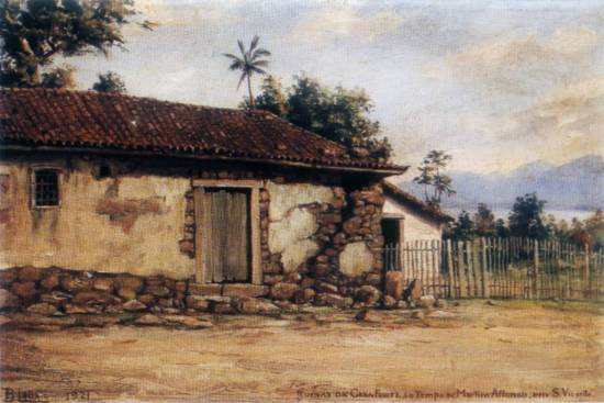 Detalhes no reboco descascado da casa e na vegetação diferenciam estas duas telas que Calixto pintou sobre o mesmo tema, as ruínas da casa de pedra que Martim Afonso de Souza teria usado no tempo da fundação de São Vicente, e que também funcionava como fortificação na defesa contra os indígenas inimigos. Os dois quadros (óleo sobre tela) medem 40 x 60 cm.