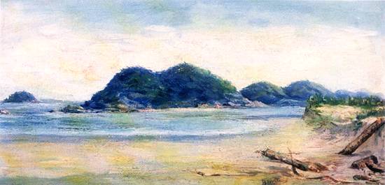 Um dos trabalhos favoritos de Calixto era registrar quase fotograficamente cenas da região em que vivia, especialmente junto ao mar. Este quadro a óleo sobre tela de 27,5 x 54,5 cm,  pertencente a uma coleção particular, mostra a praia de São Vicente tendo ao centro a Ilha Porchat, possivelmente nos primeiros anos do século XX (a obra não foi datada):
