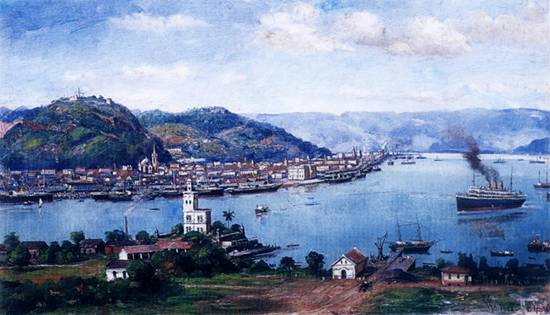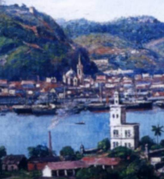 Outra reprodução fotográfica do quadro, denominado Porto e Cidade de Santos Vistos do Itapema: