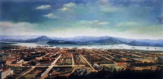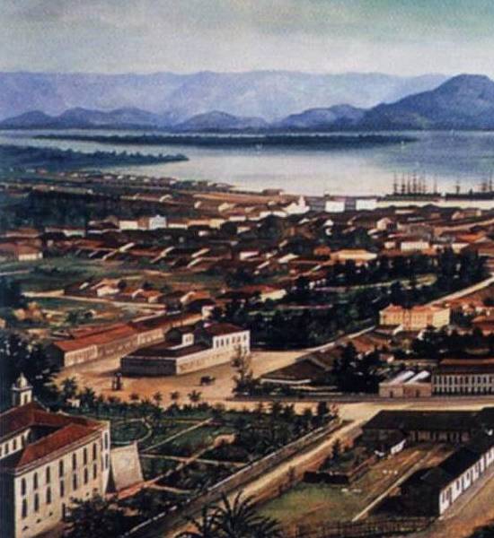 seu porto, com o detalhamento da zona urbana central, a partir da encosta do Monte Serrat, foi registrada nesta pintura a óleo
