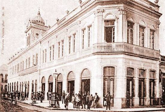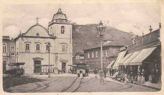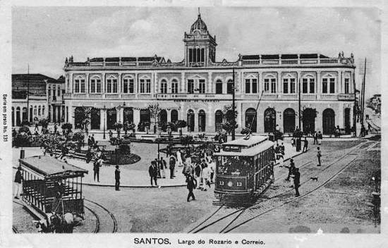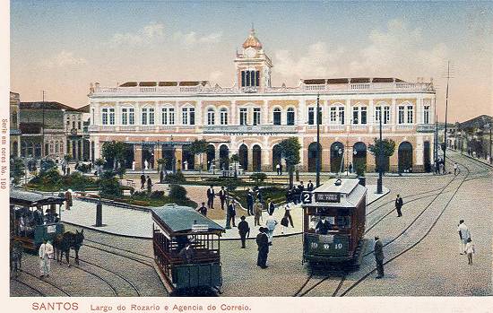 Clássica foto da Praça Rui Barbosa (antigo largo do Rosário), com o prédio do Correio, em cartão postal do final da primeira década do século XX: