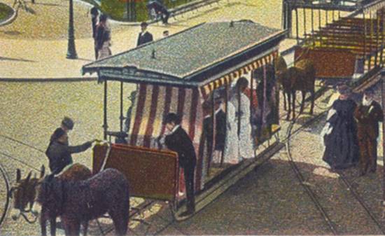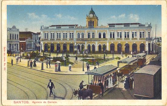 A mesma imagem, colorida à mão, foi transformada em cartão postal da Union Postale Universelle. No primeiro plano, ao centro, um bonde da linha Boqueirão via Rua Sete de Setembro e outro da linha 2 (São Vicente via Praia), e à esquerda um bonde de tração animal: