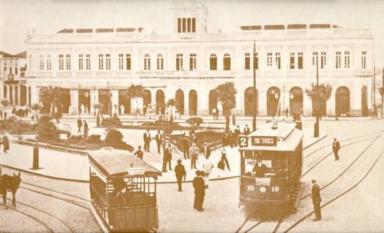 Largo do Rosário (hoje Praça Rui Barbosa, vendo-se o prédio da antiga Agência do Correio entre as esquinas com as ruas General Câmara (à esquerda) e João Pessoa (antiga Rua do Rosário, à direita). Em primeiro plano, os bondes puxados por burros e os elétricos: