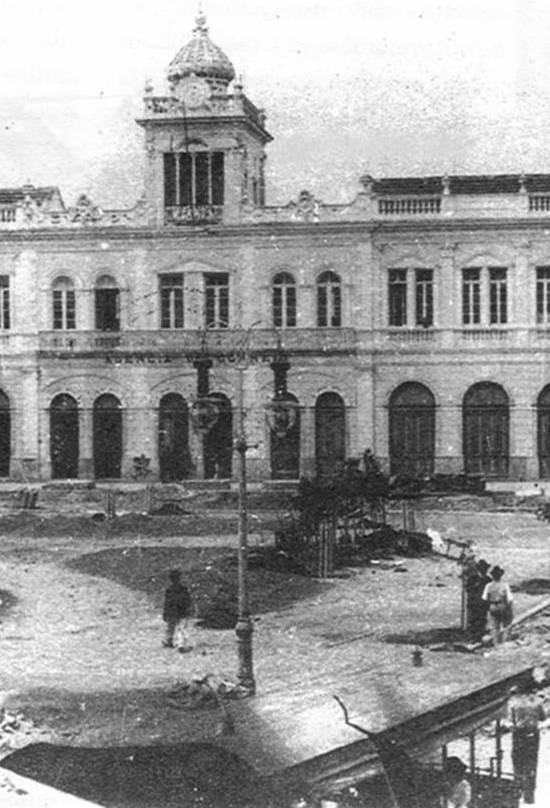 Detalhe da foto, com o bloco central do prédio dos Correios e, na praça, um dos antigos lampiões a gás, prestes a serem substituídos pelos elétricos: