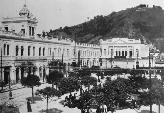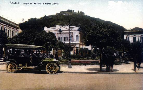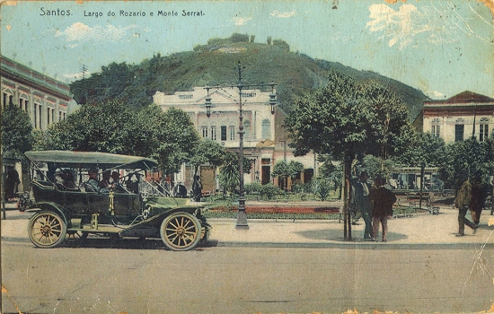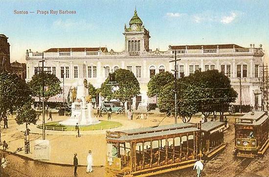 Em cartão postal da época da Primeira Guerra Mundial, a Praça Rui Barbosa, tendo ao fundo o Monte Serrat e à esquerda o prédio dos Correios: