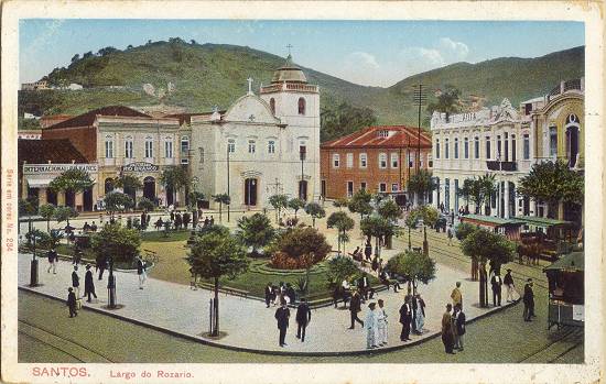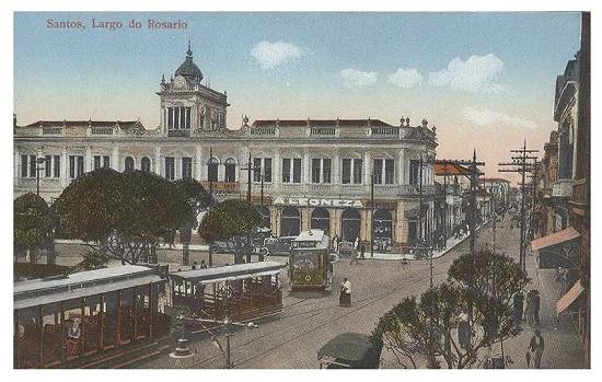 O Largo do Rosário, em cartão postal colorizado e circulado por volta de 1919, destacando-se a loja da fábrica de doces (especialmente de banana) A Leoneza,