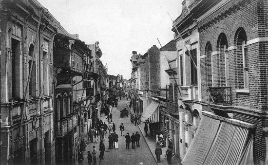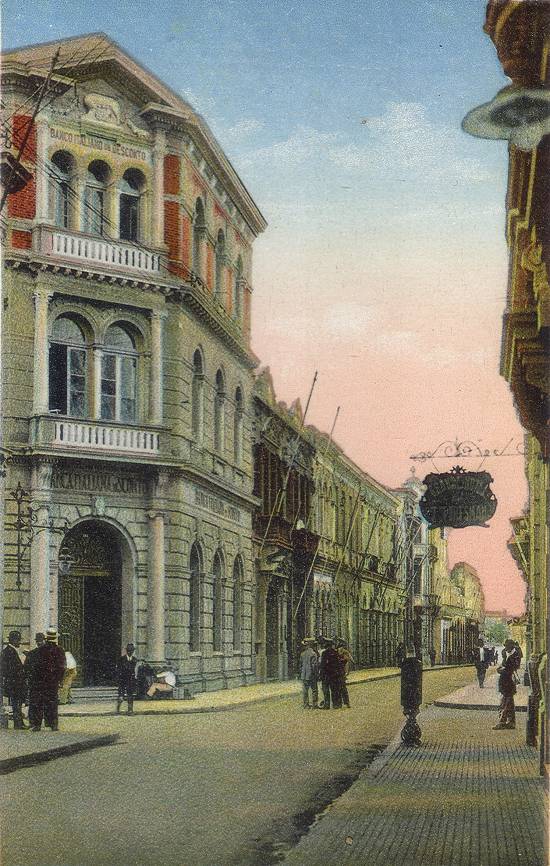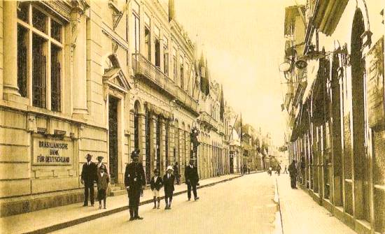 A rua, por volta de 1910, em cartão postal da época, quando era crescente o número de bancos ali instalados, como o Brasilianishe Bank für Deutschland, que