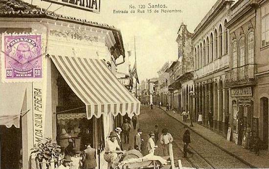 Mais uma vista dessa rua, antes da Primeira Guerra Mundial, em cartão postal de M. Pontes vendido na tradicional loja santista Bazar de Paris: