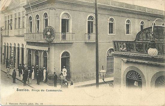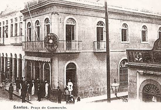"Um cartão postal bastante disputado pelos colecionadores é este que mostra a Associação Comercial de Santos pouco depois de sua inauguração, no final do século 19. A imagem é do