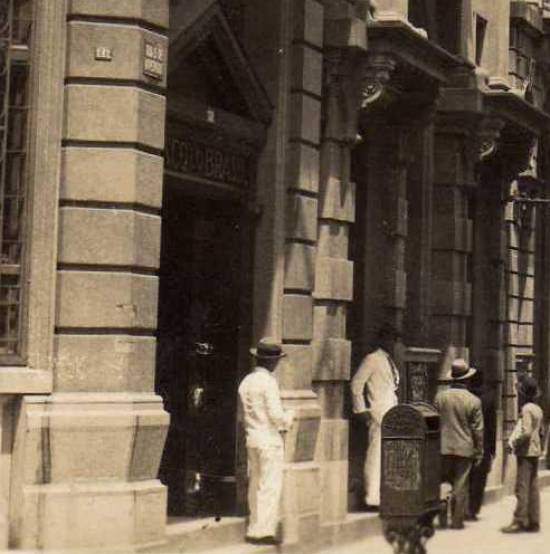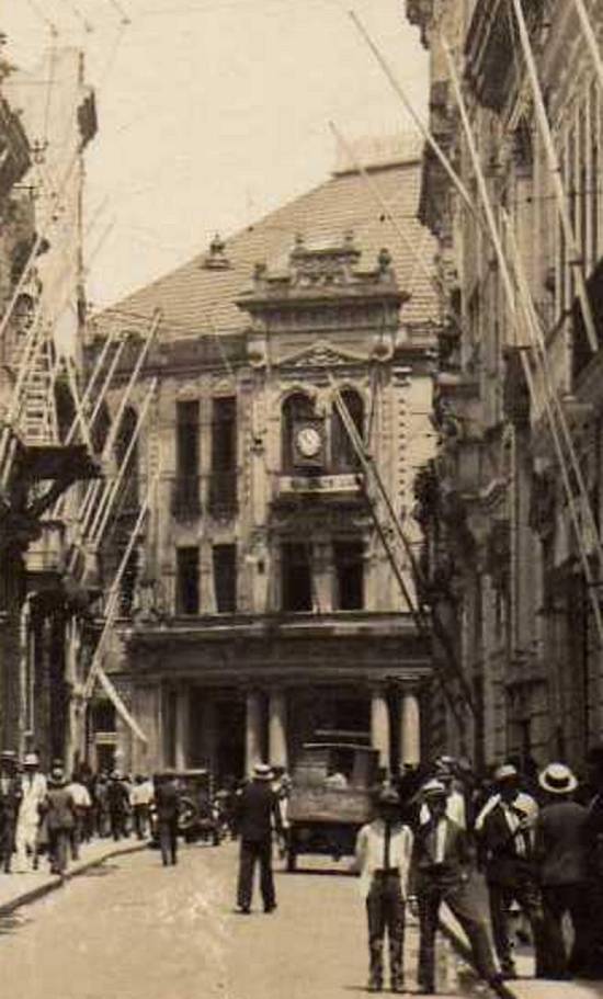 "O cartão-postal, datado de 1928. Mostra a Wall Street Santista, como era conhecida a Rua XV de Novembro - O coração financeiro da Cidade de Santos. Lá era o reduto das firmas exportadoras de café, agências de navegação, bancos nacionais e internacionais, consulados, seguradoras, empresas de telégrafo, tipografias, restaurantes e tudo mais de uma importante via de negócios. Um dia de bons negócios realizados na Bolsa Oficial do Café repercutia diretamente na Cidade. Ao fundo o prédio onde funcionava o Banco de Crédito Real de Minas Gerais, já demolido. Notem os detalhes do postal, como mastros para ostentação de bandeiras e as vestimentas da época", comenta o cartofilista e despachante aduaneiro Laire José Giraud, ao apresentar esta imagem: