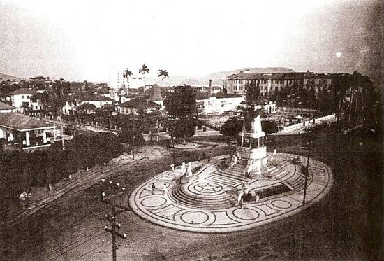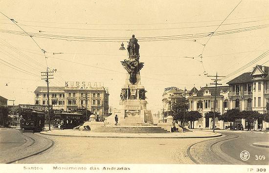 Outra vista da praça, em ângulo aproximado e na mesma época, com o monumento aos Andradas e ao fundo ainda o Parque Balneário Hotel: