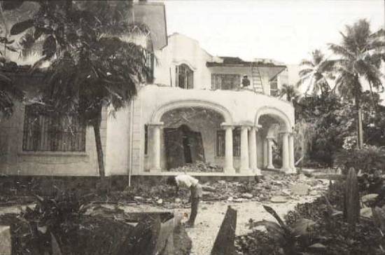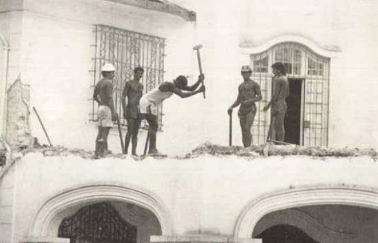O início da demolição do último casarão da praça, o palacete Áurea Conde (entre a Av. Ana Costa e a Rua Galeão Carvalhal), foi registrado nestas três fotos do antigo jornal Cidade de Santos: