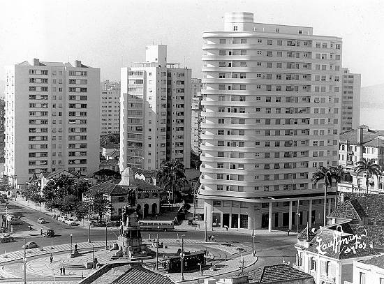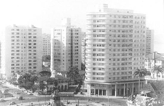 Nesta rara imagem de 1956, do fotógrafo santista Kauffmann, vê-se ainda um conjunto de casas residenciais e comerciais que existia entre as ruas Dr. Galeão Carvalhal (à esquerda) e a