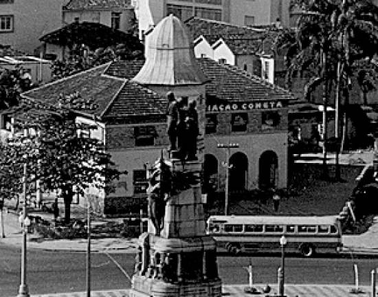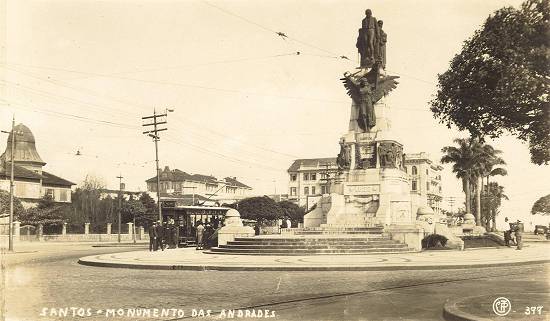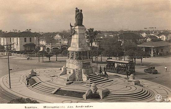 Costa, que mostra alguns deles ao fundo, na década de 1950, junto à praça, tendo ao centro o monumento aos Andradas: