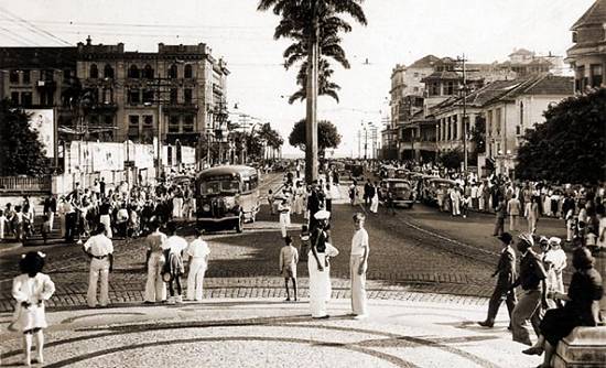 Uma festividade possivelmente na década de 1940 atraiu grande número de populares ao trecho final da Av. Ana Costa, visto desde a Praça da Independência.