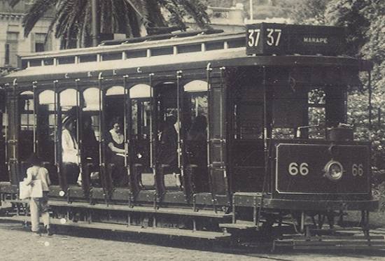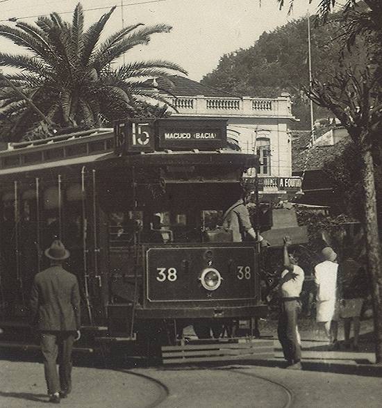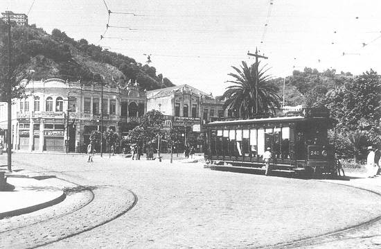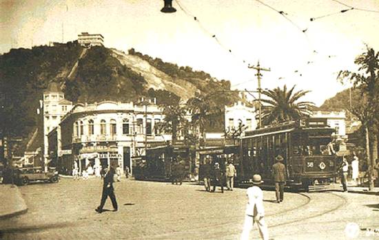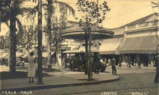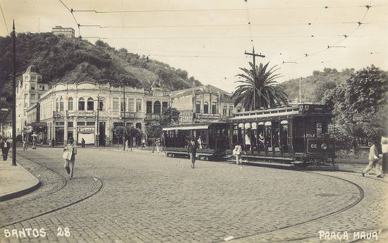 Nesta foto, da década de 1930, a Praça Mauá com o Monte Serrat ao fundo, e o ponto de parada do bonde 4 (que ligava o Centro à Ponta da Praia, via Avenida Conselheiro Nébias) - e mais uma linha de trilhos para os bondes, denotando a expansão desse meio de transporte: