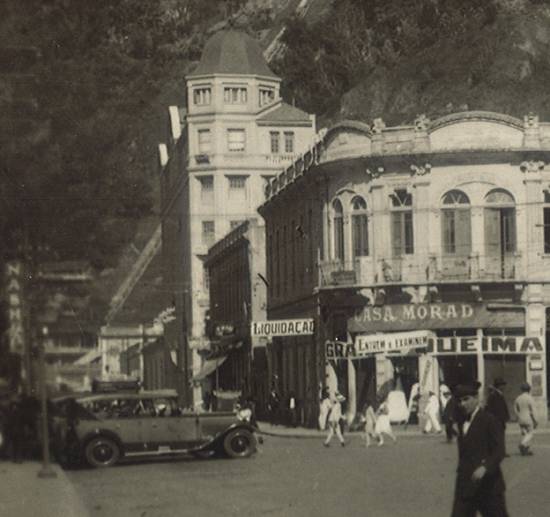 O mesmo local, em 1916, vendo-se os prédios ocupados por A Equitativa e Casas Pernambucanas, em lados opostos da esquina com a Rua Riachuelo: