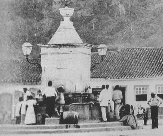 Largo da Coroação, atual Praça Visconde de Mauá, vendo-se o chafariz inaugurado pelo imperador D.Pedro II em 1846 e, à direita da foto, o Teatro de Santos, na esquina com a atual Rua Riachuelo.