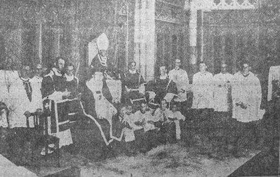 No salão, o sr. bispo diocesano, circundado por seus assistentes e dignidades