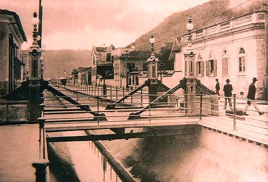 Inúmeras pontes foram feitas para permitir o trânsito sobre os canais santistas. Estas são algumas delas, em imagens da época de sua construção: