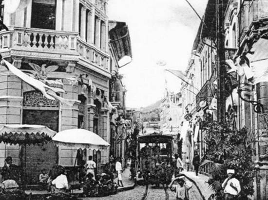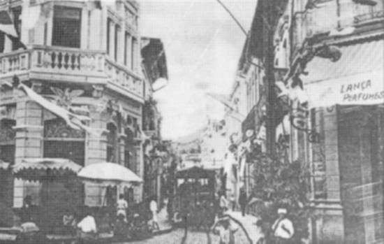 Rua XV de Novembro engalanada para o Carnaval de 1906, com lojas vendendo lança-perfumes e um bonde ao centro da foto: