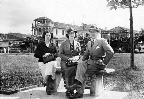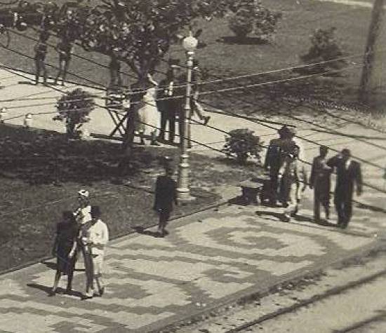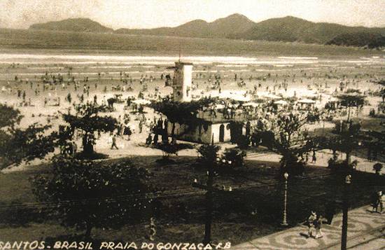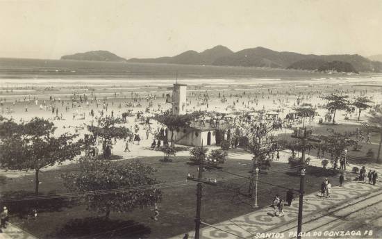 Nesta foto de 1942, turistas no jardim da praia do Gonzaga, tendo ao fundo o Hotel Familiar Gonzaga e a Pensão Moderna, já demolidos. Também é vista a Pensão Belmar, bem como um veículo do antigo