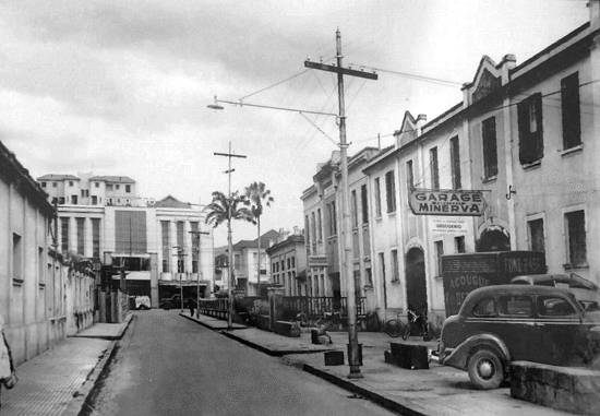 Uma rara foto mostra a Rua Fernão Dias, tendo ao fundo, já na Avenida Ana Costa, as instalações do hotel-cassino Atlântico: