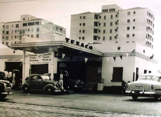 Nesta foto, um posto de gasolina que funcionou na Rua Marcílio Dias, com bandeira da empresa petrolífera norte-americana Texaco, em 1954: