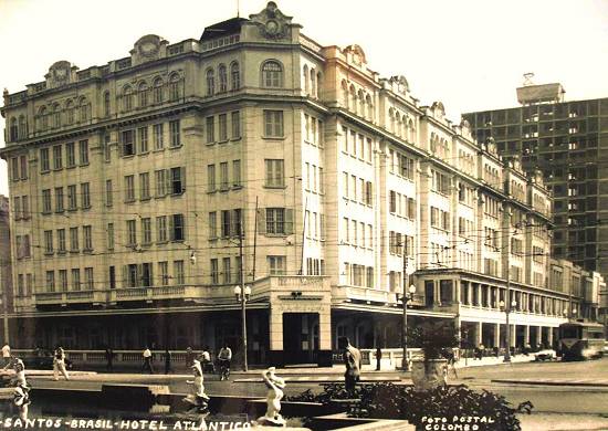 Neste cartão postal da década de 1950, o hotel Atlântico com a Fonte Nove de Julho em primeiro plano e, ao fundo, em construção