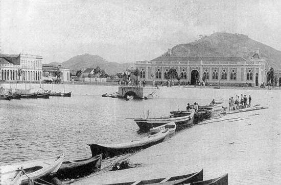 Nesta foto, feita em 1907 por José Marques Pereira, vê-se a Bacia do Mercado, área da atual Praça Iguatemi Martins, com o antigo prédio do mercado e as características catraias. Este prédio, inaugurado em 1902, foi reconstruído em 1947, e em 1955 ampliado com um segundo andar e o pavilhão de pescado: