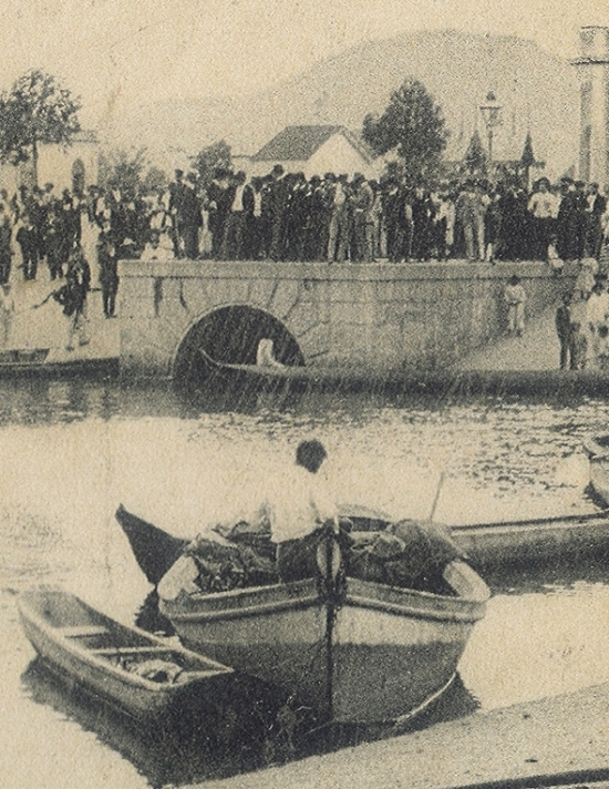 Neste cartão postal enviado em 26/11/1925 para a cidade portuária paranaense de Paranaguá, vê-se a bacia do Mercado em uma festividade: