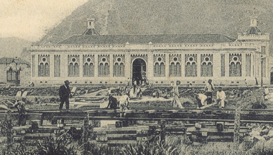Obras do cais e de aterro junto ao antigo prédio do Mercado Municipal, na primeira década do século XX, em cartão postal produzido pela empresa M. Pontes & Comp. para a então importante loja Bazar de Paris: