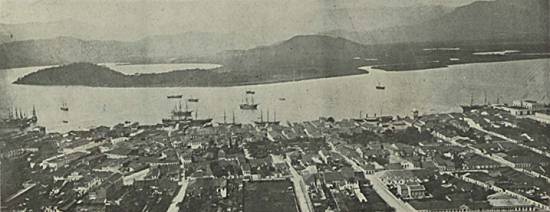 A Santos, fundada em 1545, apenas em 1839 foi concedido o título de cidade. E bem cabido foi, porque em Santos se concentra tudo o que constitui uma cidade moderna. Excelentes edifícios públicos como a Alfândega, a Câmara, o Arsenal, o Hospital, que é um dos melhores do Estado, e que a Misericórdia sustenta e o da Beneficência Portuguesa, teatros, igrejas magníficas como a matriz dedicada a Nossa Senhora do Rosário, e residências particulares que provam ao mesmo tempo o gosto e a fortuna dos proprietários. Mas o que acima de tudo valoriza a cidade é o seu magnífico porto, a 10 quilômetros da baía de O. Abre diretamente para o Oceano abrangendo uma área de 36 quilômetros quadrados.