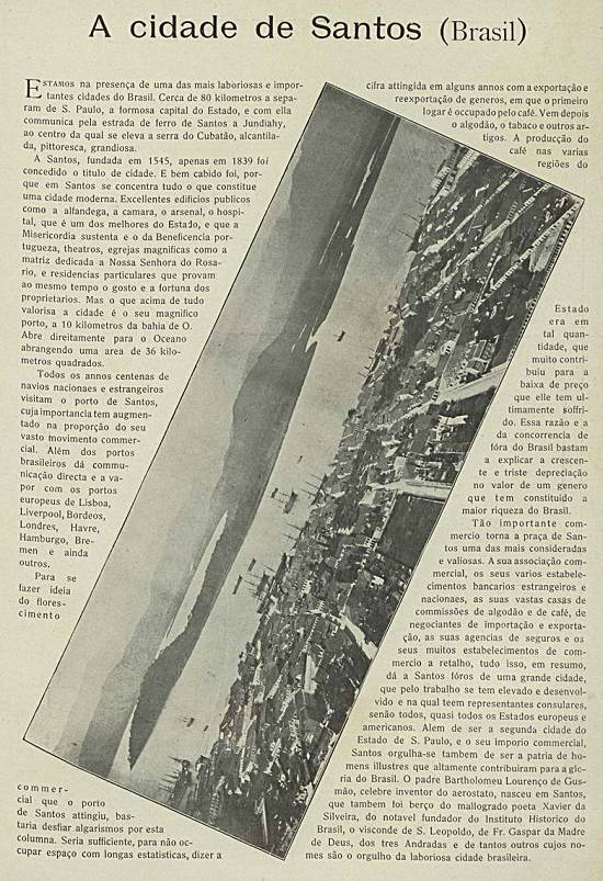 Em 1º de janeiro de 1900, a revista quinzenal Brasil-Portugal, editada em Lisboa por Luiz Antonio Sanches e impressa nas oficinas da Companhia Nacional Editora, dedicou a página 14 de sua edição 23/Ano 1 à cidade de Santos (acervo Hemeroteca Digital - Lisboa - ortografia atualizada nesta transcrição - acesso em 7/6/2014):