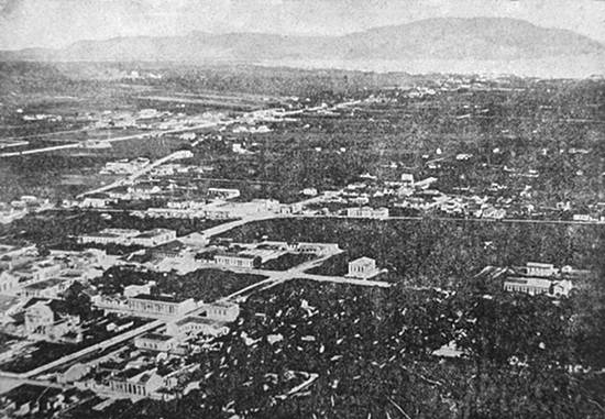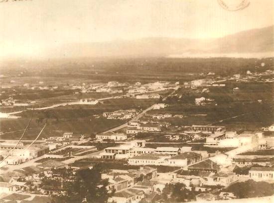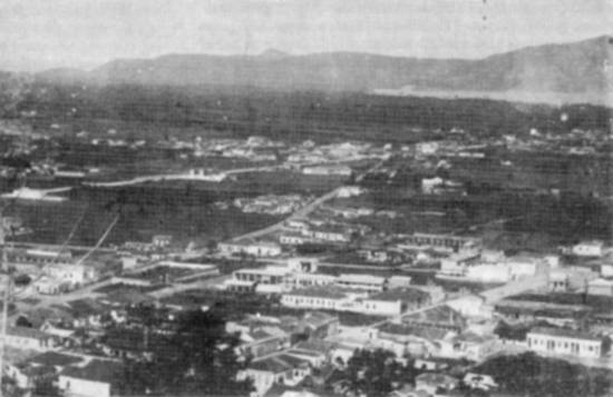 chamados Dois Rios, no futuro bairro do Gonzaga), à esquerda o novo traçado da Avenida Washington Luiz, ao fundo o terreno do Boqueirão (com o casario ao redor da Av. Conselheiro Nébias)