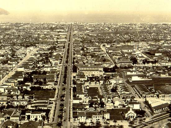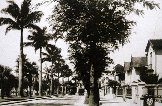 As palmeiras imperiais já dominam a avenida, vista em toda a sua extensão nesta foto do início da década de 1940 (note-se no centro da imagem inexistir ainda a torre da