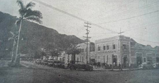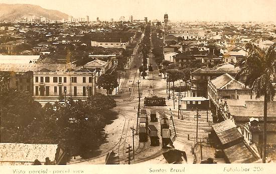 O início da Avenida Ana Costa, na Vila Mathias, na confluência com a Rangel Pestana, tendo em primeiro plano a garagem dos bondes da Cia. City, no sopé do Monte Serrate: