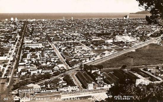 A mesma imagem, em visão mais ampla, tomada do alto do Monte Serrate e transformada em cartão postal. Partindo do centro para a direita, no primeiro plano,