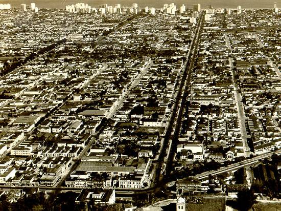 Outra vista da avenida e arredores, desde o alto do Monte Serrate, tendo ao centro na vertical a Rua São Bento, no final da década de 1940: