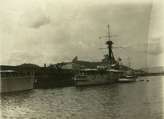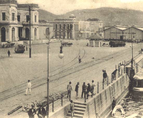 Esta imagem com aparência de noturna, mas obtida por escurecimento da lente, foi tomada desde as imediações do fortim do Itapema, que é visto à esquerda, com o porto ao fundo. O bilhete postal é da década de 1910: