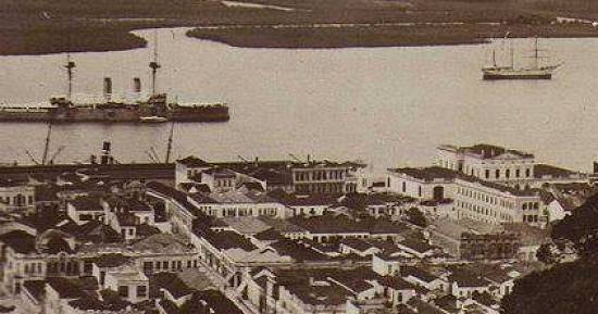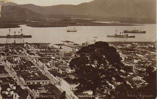 Neste cartão postal vê-se uma foto do porto santista em 1922, durante visita de belonaves japonesas. A imagem foi obtida da encosta do Monte Serrat: