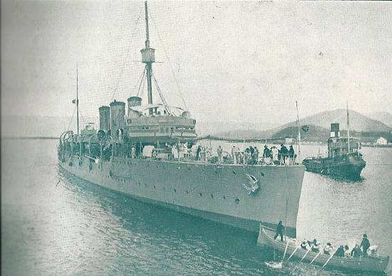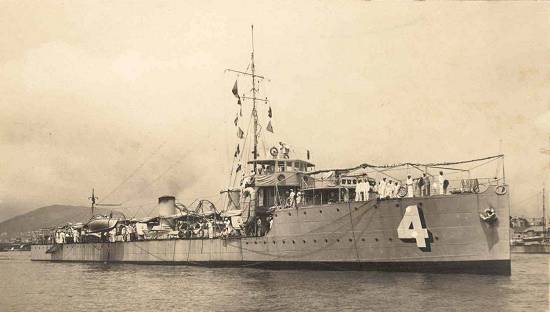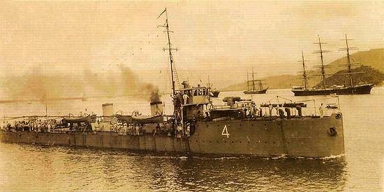 Um contratorpedeiro da classe Pará navegando pelo estuário do porto de Santos, no início do século XX. Essa classe de belonaves participou da Primeira Guerra Mundial. Ao fundo, a Ilha Barnabé: