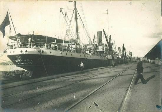 Vapor España Nº 4, registrado no porto espanhol de Tenerife, nas Ilhas Canárias, por volta de 1920, atracado ao cais junto ao Armazém 2 da Companhia Docas de Santos (CDS):